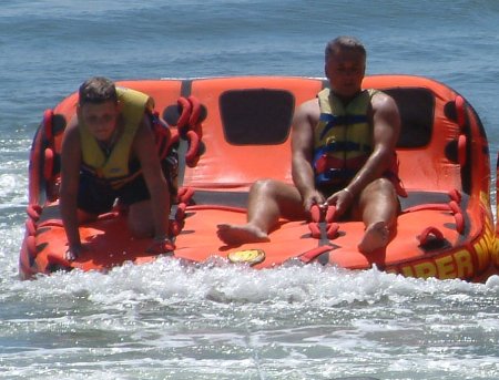 He managed to persuade me to go with him, I must be mad. The ride was fun, the driver had two inflatable's, with Kev and I on one, and a young couple on the other. He kept crashing the 2 together, until Kevin lost his grip and ended up in the drink.