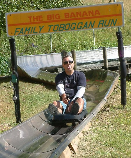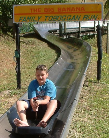 We set off to find something to do, and by 9am were at an attraction called the "Big Banana" This is a banana plantation with a few rides (a monorail-closed because it was no longer reliable, an indoor ski slope-closed because it lost too much money, a sky walk to a viewing platform to see along the coast, the climb was open, but the viewing platform was closed due to vandalism, a zip line-closed, no explanation) a working toboggan run, where you ride small wheeled toboggans down a steel chute, this was fun, I rode once, Kevin did the run 4 times. There were also a few shops where we bought banana themed souvenirs and a sweet shop where they make sweets while you watch.